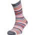 Jolies chaussettes multicolores, sur une base de gris chiné plein de rayures de couleur et de largeur différentes dans des tons doux de corail, bleu ou vert d'eau.