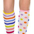 Chaussettes fantaisie blanches avec des rayures multicolores sur une jambe et pleins de pois colorés sur l'autre (rouge, jaune, orange, bleu...), effet dépareillé très girly, sympa aussi pour accessoiriser des tenues cosplay, sweet lolita,...